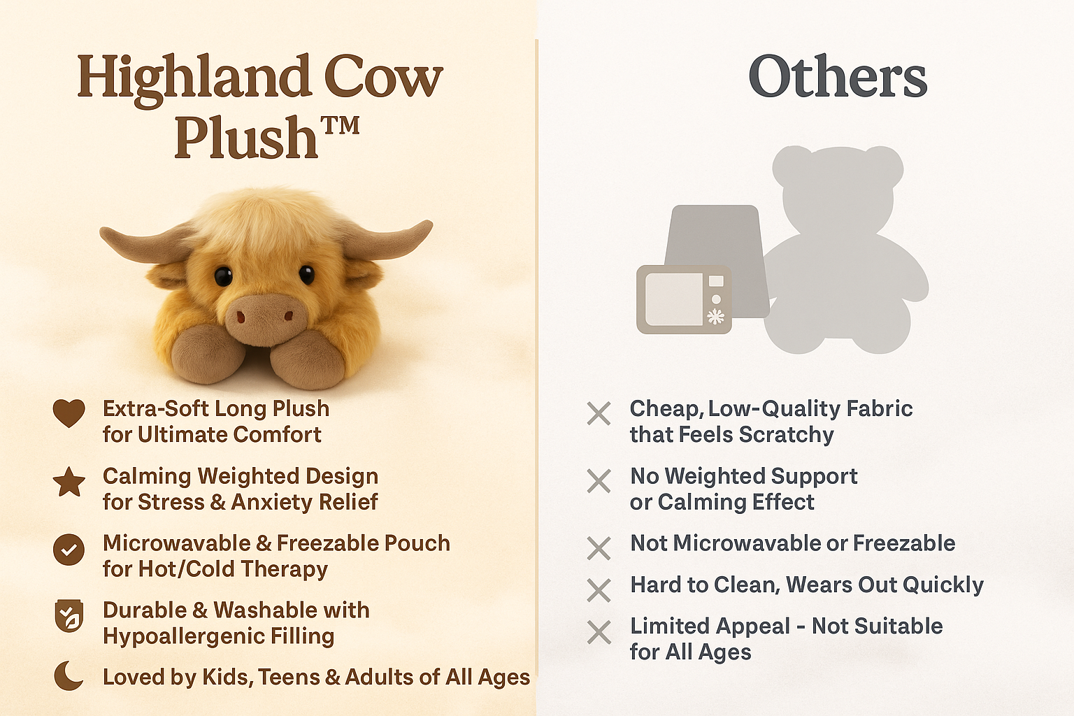Unlike ordinary toys, the Highland Cow Plush combines hug-ready softness, stress & anxiety relief, and high-quality, hypoallergenic materials. It’s not just cute — it’s designed to give you a real sense of calm and comfort with every hug.